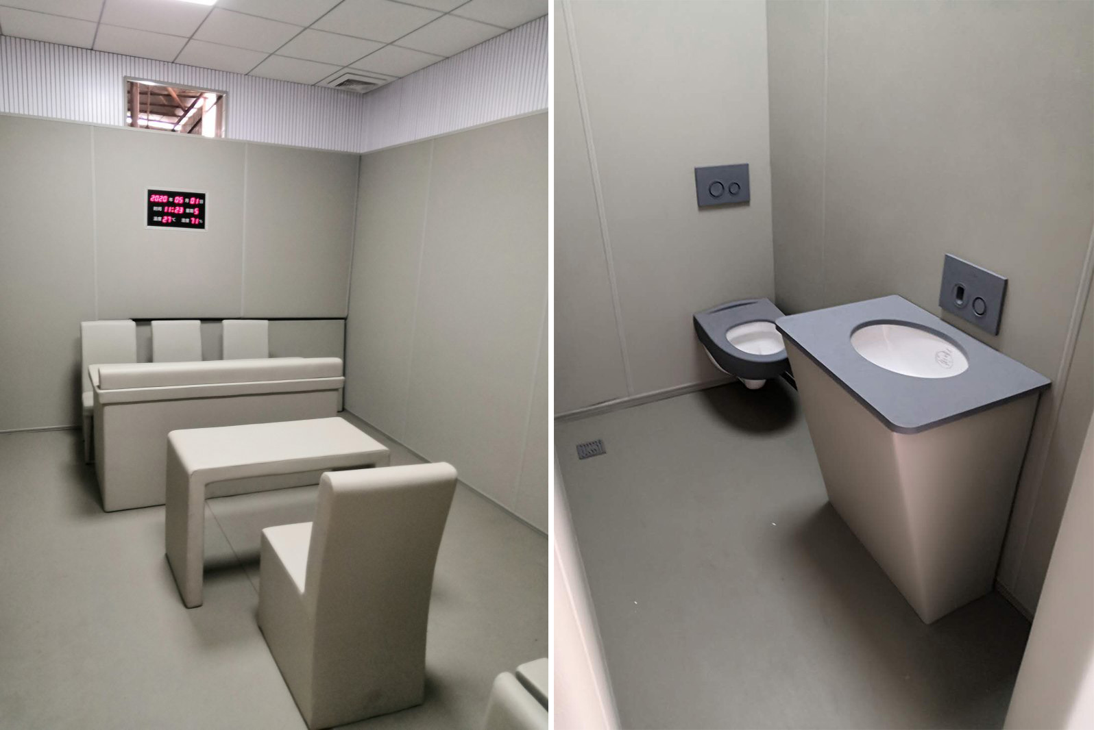 江苏星美谈话室防撞软包厂家生产材料在经过多层的聚乙稀棉和阻燃皮革的无胶复合,制成可使用的防撞软包,在谈话室墙面、地面、桌椅、卫浴洗手台马桶等上面应用。谈话室防撞软包的生产符合消防检测的阻燃B1级,环保检测的E0级才可以出厂,厚度需要达到20mm~30mm之间,误差厚度不能超过±2mm;总体规格符合墙面安装应用的宽度1250mm,高度2450mm,软包的颜色有浅灰色、米黄色两款,收边用的有中线硅胶收边条,硅胶地脚线,门边线等,并且根据墙体的吊顶高度决定是否满铺或者高于2450mm上的位置采用木质吸音板收边。