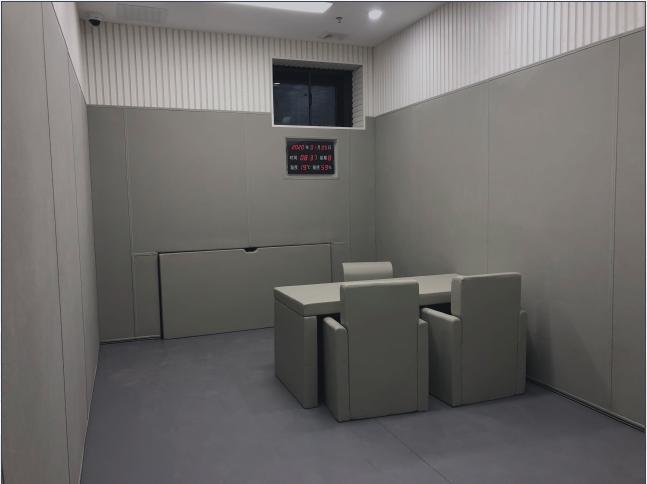 北京留置中心留置室防撞软包厂家材料,主要由阻燃皮革、纳米防火棉等组成,留置中心内部留置室使用的防撞软包主要功能是通过对墙面的软质处理,室内设施防撞化,根据纪委留置室单位办案区建设标准建造,在软包防撞墙板边缘安装有收边条底座作为固定装置,用于边缘的整合,具有阻燃、隔音、吸音、抗撞击等功能,主要规格为1250*2450mm,厚度有达到20~30mm,饰面颜色有浅灰和米黄,在留置中心内部除了墙面、还有地面、桌椅、留置床、卫生间内部的洗手台、马桶等等都是防撞软包结构包裹组成的、该留置室防撞软包厂家材料已组成了完整的防撞系统,确保留置室内部的安全,可起到全方位防撞效果。